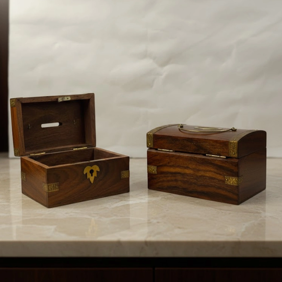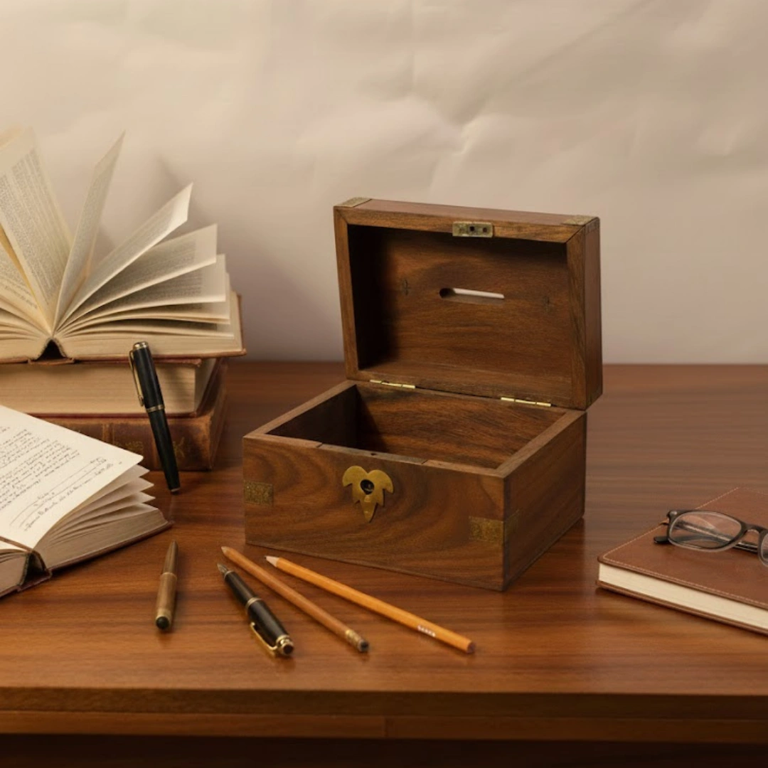 Classic wooden money bank crafted from solid wood and finished with a secure brass lock. Designed for safe savings with a timeless heritage look, it’s perfect for home décor, daily use, or gifting.