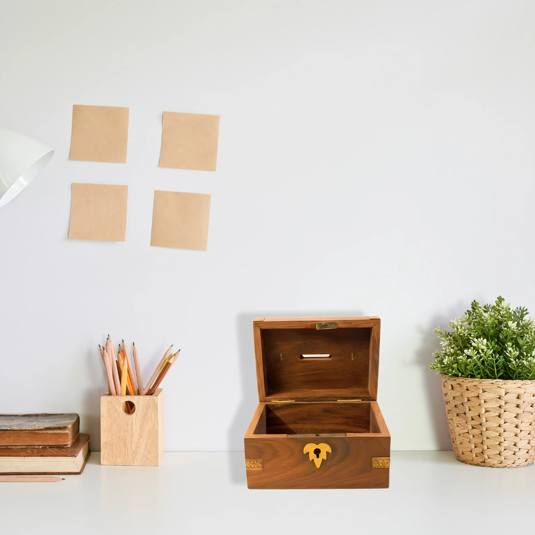 Designed to securely store coins and currency, it encourages mindful saving while adding a decorative accent to shelves, desks, or bedside tables. The smooth wooden finish and sturdy construction ensure long-lasting use, making it suitable for both adults and children.
