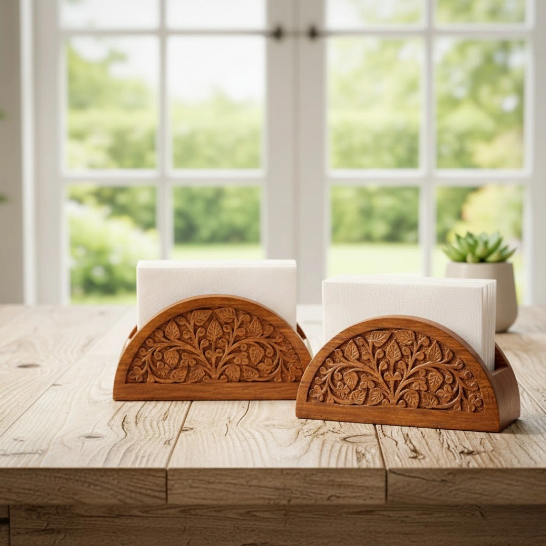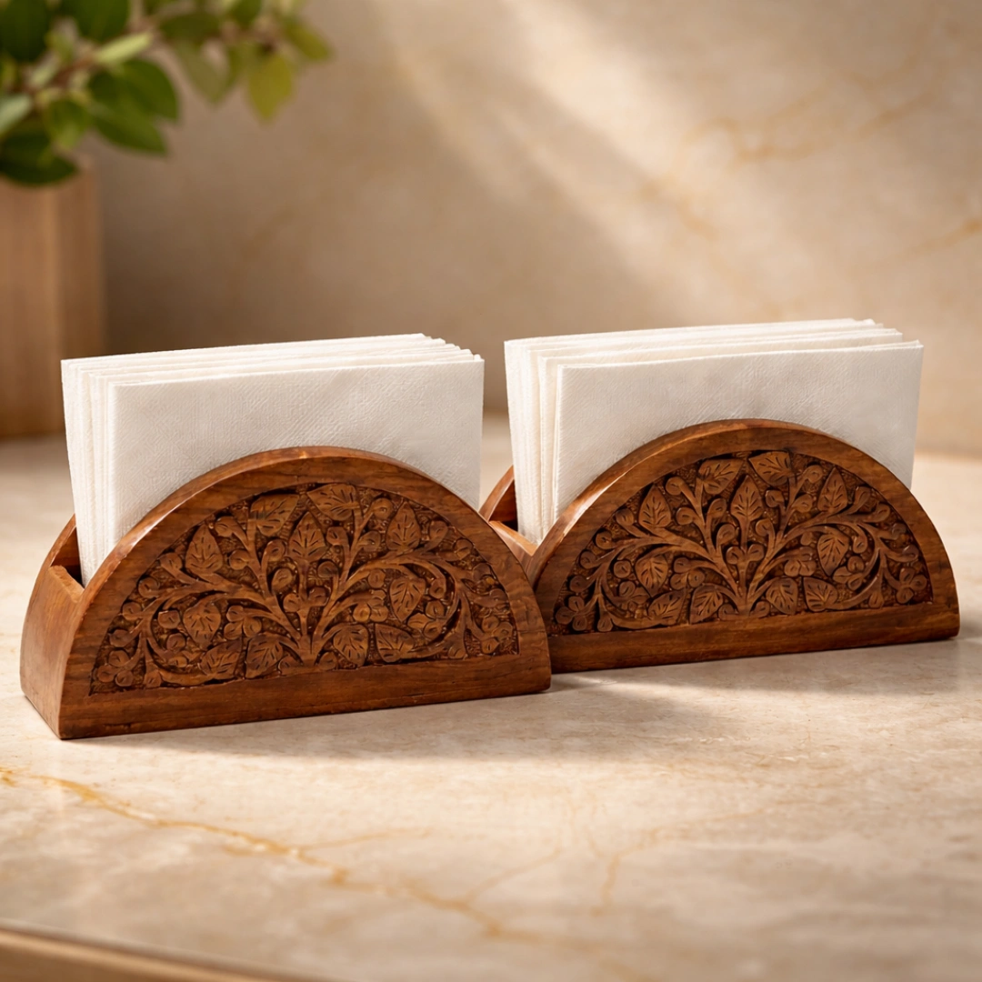 Elegant hand-carved wooden napkin stand featuring a timeless leaf motif. Crafted from natural wood, it adds a warm, artisanal touch to dining tables while keeping napkins neatly organized. Durable, decorative, and perfect for everyday use or gifting.