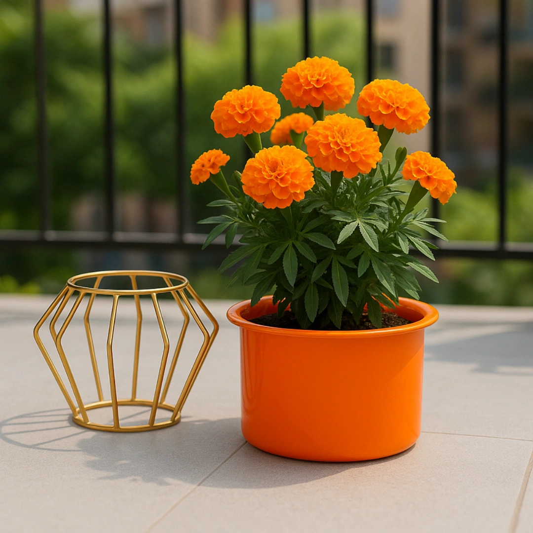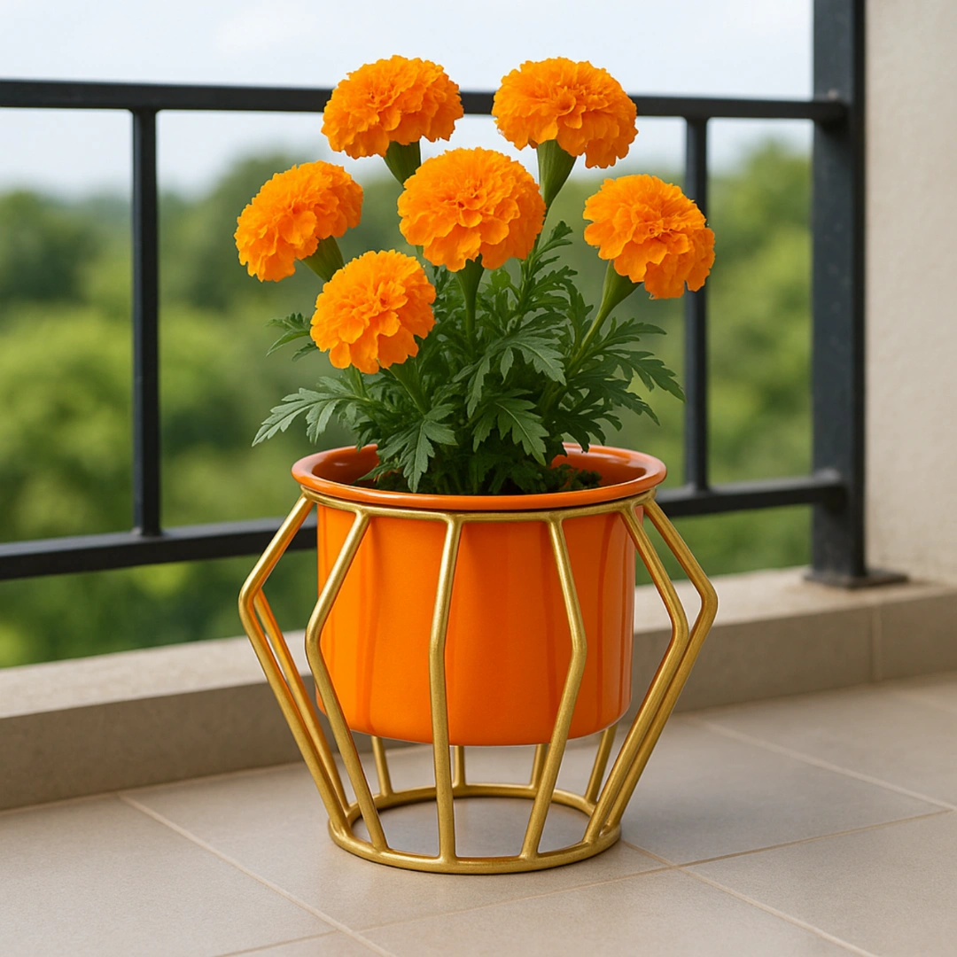 This stylish metal planter pot comes with a premium golden stand and vibrant orange finish, perfect for adding a modern touch to your home and office décor.