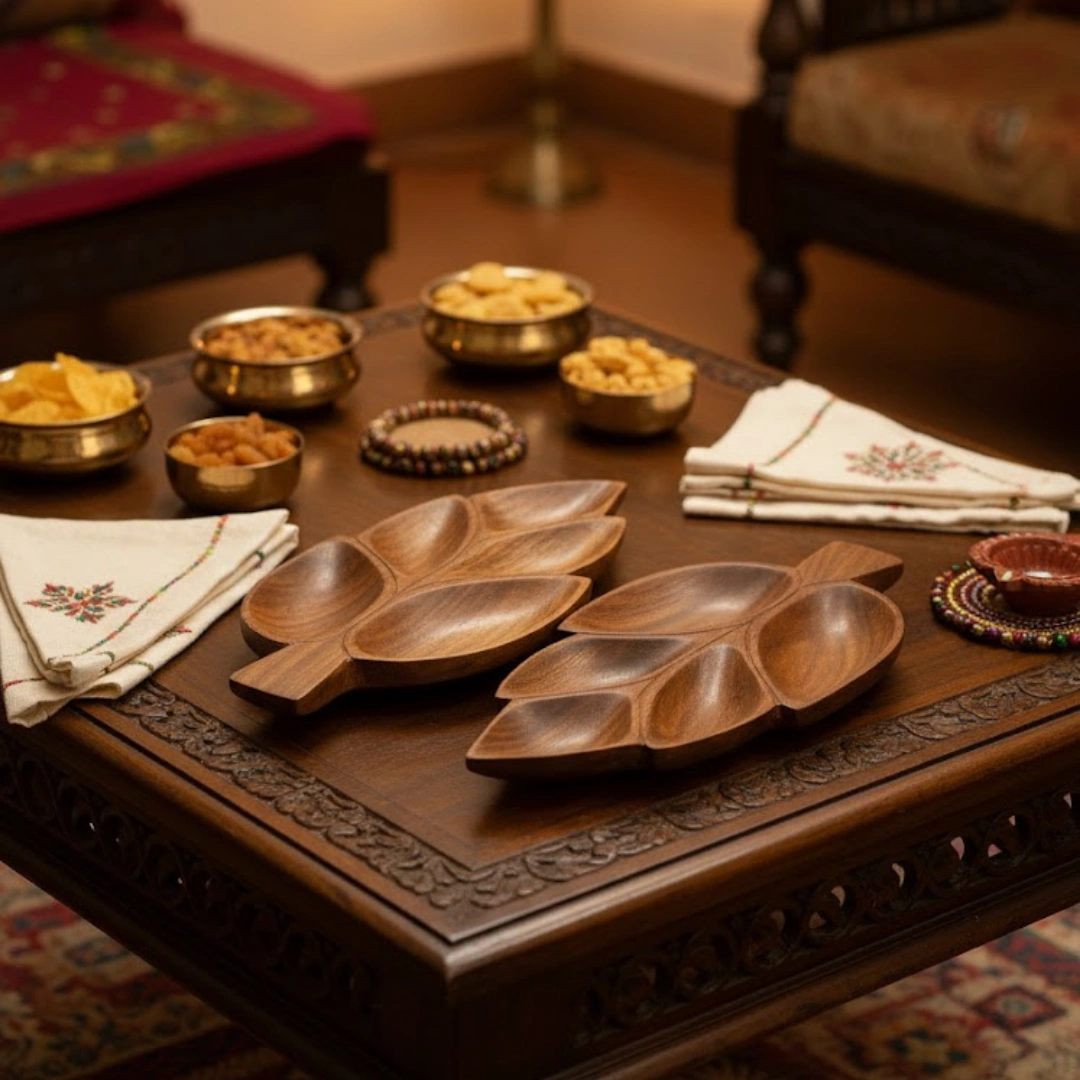 Double the elegance with the Nestloom Double Leaf Wood Nut & Snack Server Set. This pack of two handcrafted wooden trays features an exquisite 5-section leaf design, perfect for organizing and serving a variety of dry fruits, nuts, and seeds. Carved from premium solid wood with a rich, natural grain, these trays offer a symmetrical and sophisticated touch to any dining table or party spread. Durable, food-safe, and artfully designed, it is the ideal set for stylish hosting and thoughtful gifting.