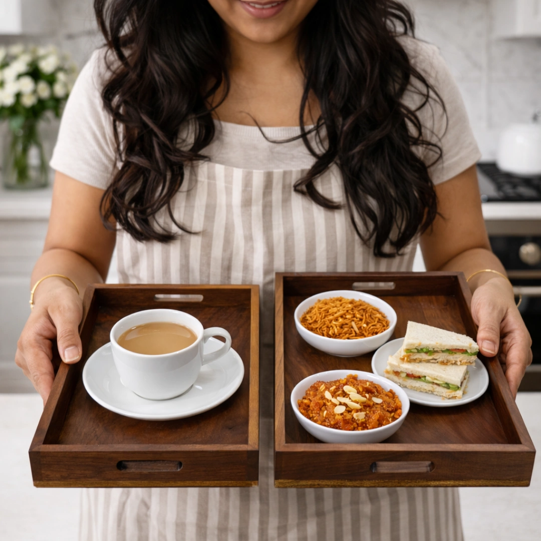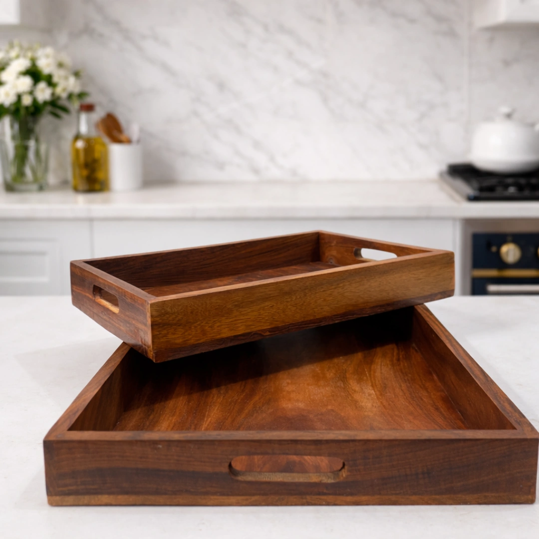 This premium handcrafted wooden serving tray set is perfect for your home and kitchen. Made from strong, high-quality wood with a smooth finish, it is ideal for both serving and home décor.